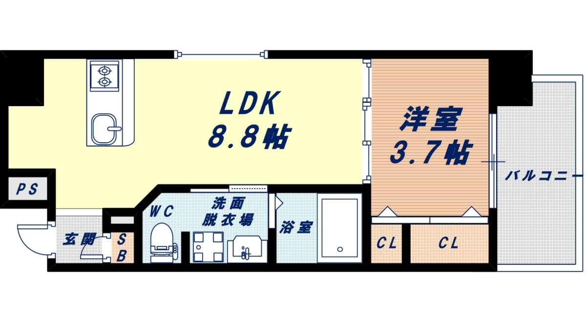 LDKは8.8畳あり、ダイニングテーブルを置いてもゆとりがあり、一人暮らしはもちろん二人暮らしにも対応できる空間です。洋室はコンパクトな3.7畳ながら、寝室やワークスペースとしてちょうど良いサイズ感で、引き戸で洋室と仕切ることができるため、生活スタイルに合わせて開放感を楽しんだり、独立した空間を作ったりと柔軟な使い方が可能です。