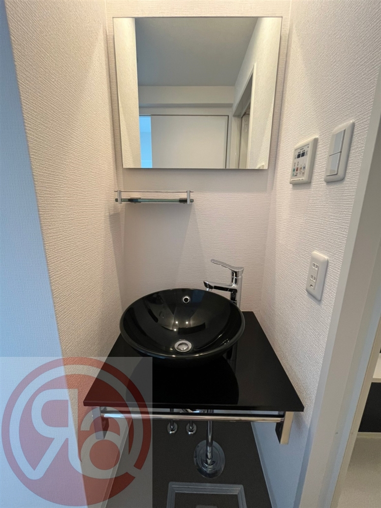 脱衣室の独立洗面台は、ブラックの丸いシンクが印象的なデザイン。まるでホテルのパウダールームのような高級感があり、毎朝の身支度が少し特別な時間になります。鏡や照明の配置にもこだわりが感じられ、スタイリッシュで清潔感のある空間です。脱衣スペースも確保されているため、機能性とデザイン性の両立が魅力です◎