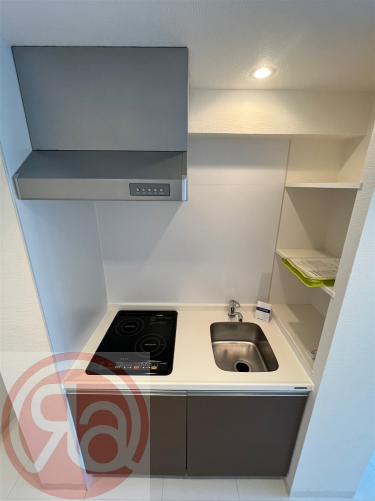IH2口コンロを備えたキッチンは、シンプルながらも機能性の高い設計で、上部に収納棚がない分、すぐ横に棚があり、食器や調味料をすぐ手に取れる位置に置けます。調理動線がスムーズで、狭すぎず広すぎないちょうど良いサイズ感。白を基調とした明るいスペースで、自炊がより快適になります。