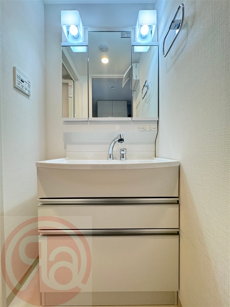 脱衣室には独立洗面台が設置されており、朝の支度や帰宅後の手洗いもスムーズにできます。脱衣室の前には洗濯機置き場も完備されており、生活動線がしっかり考えられた使いやすい配置です。白を基調とした明るい洗面空間は清潔感があり、日々の暮らしをより心地よくしてくれます。