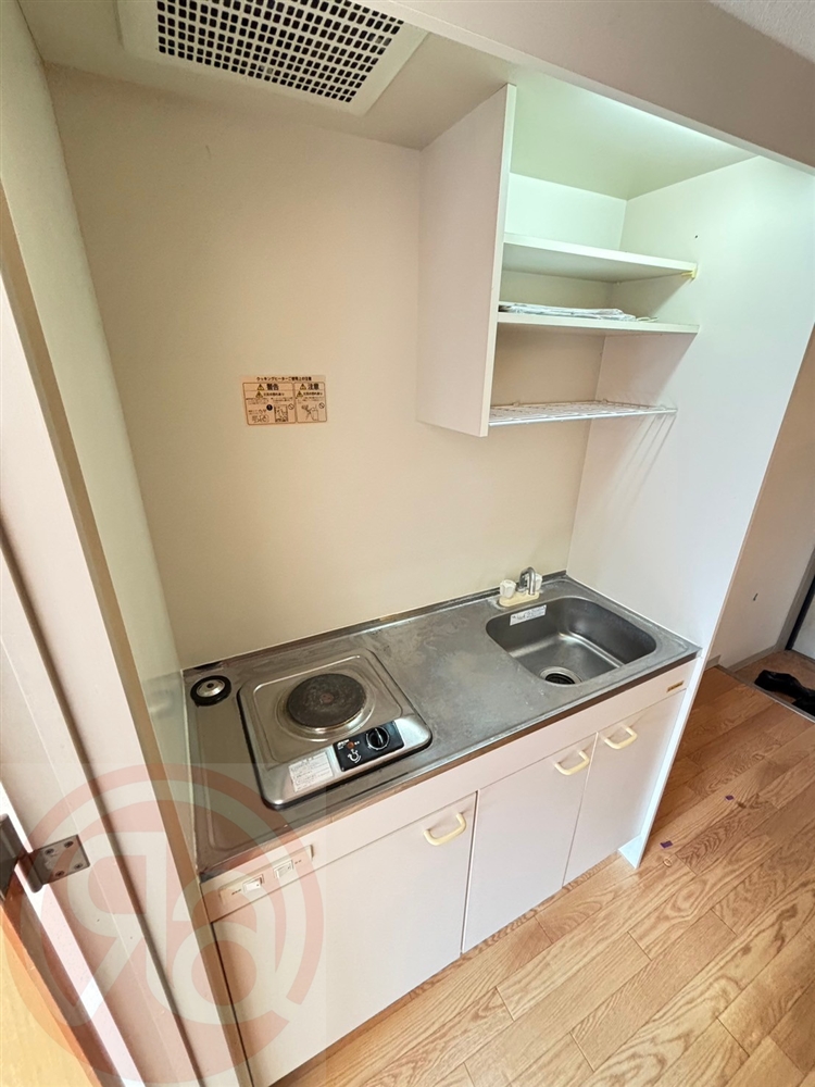 コンパクトながら使い勝手の良いキッチンが備わっています。調理スペースもしっかり確保されており、自炊派の方も満足の設備です。シンクは清潔感のあるステンレス製で、お手入れも簡単。キッチン周りに収納棚が設置されているため、調理器具や食器の整理もスムーズに行えます。