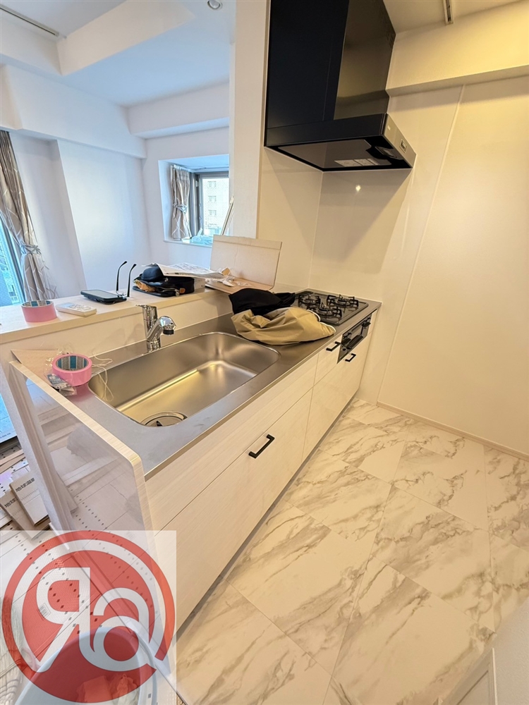 LDKの一角に配置されたキッチンは、調理スペースと収納がバランスよく確保されており、自炊派の方にも心強い設備。3口ガスコンロにグリル付きで同時調理が可能で、複数の調理工程が同時に行える広さがあり、料理にこだわる方には特に魅力的な空間です。リビング側に向けた開放感のある配置で、調理中も空間の広さを感じられます◎