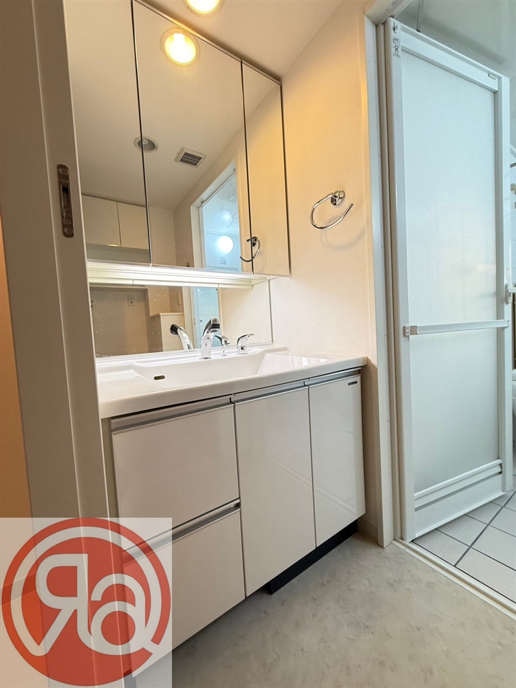 洗面室は広さに余裕があり、身支度がスムーズにできる実用的なつくりで、洗面台の横には収納スペースも確保されているため、タオルや日用品をすっきりと整理できます。家事動線も良く、浴室と洗濯機置き場が近いため、洗濯や身支度がひとつの空間で完結します。家族の行動時間が重なりやすい忙しい朝も効率的に動ける便利な設計です◎