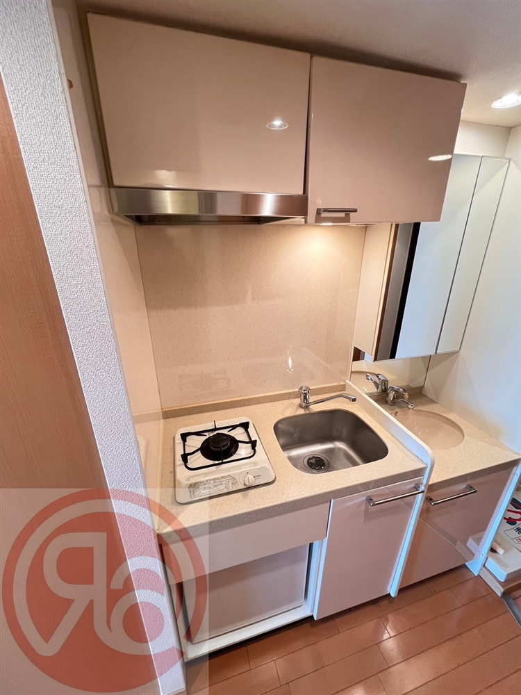 キッチンは1口ガスコンロを備えた省スペースタイプで、調理スペースはありませんが、作業台代わりになるラックやシンク上トレーなどで工夫すれば、簡単な自炊にも対応可能です。出張が多く外食中心の方や、軽めの自炊しかしない方にはちょうどいい仕様です。ミニ冷蔵庫があらかじめ設置されているため、引っ越し時に新たに購入する手間も不要なのもうれしいポイントです。