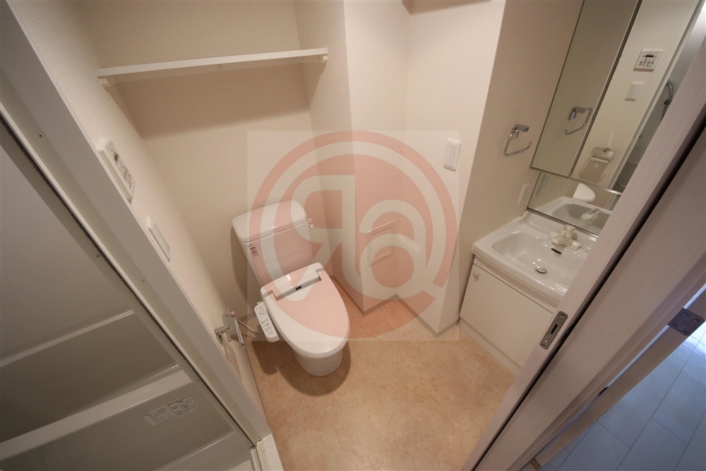 脱衣室はトイレと独立洗面台が並ぶ設計で、生活動線が非常にスムーズです。朝の準備や洗顔、歯磨き、トイレ利用まで一連の動作を無理なく行えるため、忙しい転勤者や単身者の方に特に便利です。独立洗面台は清潔感のあるデザインで、身支度の際も快適に使えます。また、洗面台周りには小物を置けるスペースが確保されており、化粧品や歯ブラシ、タオルなども整理しやすく、生活感を抑えながら整頓できます。