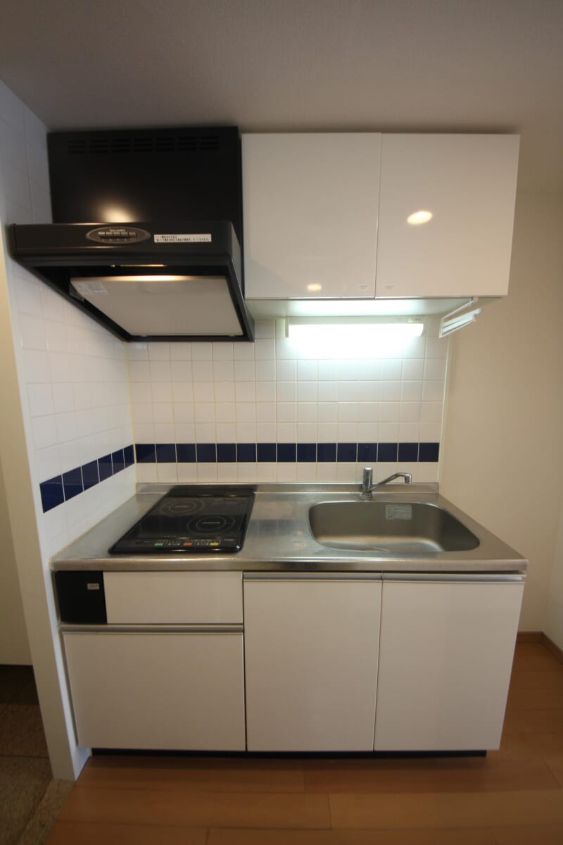キッチンはタイル貼りの壁が印象的で、デザイン性のある空間です。タイルの一列にネイビーカラーがあしらわれ、さりげないアクセントとしておしゃれな雰囲気を演出。IH二口コンロ付きのシステムキッチンで、同時調理もしやすい仕様です。シンプルながら個性を感じられ、室内全体の雰囲気を引き締めてくれます。デザインと使い勝手を両立した、こだわりのキッチンスペースです。