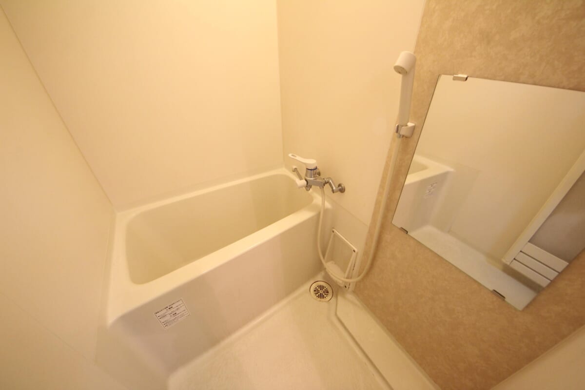 バスルームは全体的に清潔感があり、シンプルで使いやすい空間です。浴槽はしっかり深さがあり、ゆったりとお湯に浸かれる仕様。壁面の一部には落ち着いた色味が使われ、空間のアクセントになっています。シャワー付きで、日常の入浴にもさっと使いやすい設計。掃除もしやすく、きれいな状態を保ちやすいバスルームです。