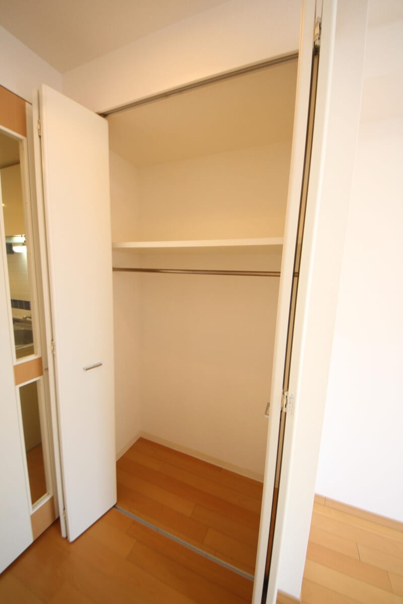 収納は上下二段構造で、使い分けしやすい設計です。下段にはハンガーラックが備え付けられており、衣類を掛けて収納できます。上段には季節物や使用頻度の低い荷物をまとめて収納可能。収納ケースなども置きやすく、空間を無駄なく活用できます。居室に物が出にくく、すっきりとした暮らしを保ちやすい収納です。