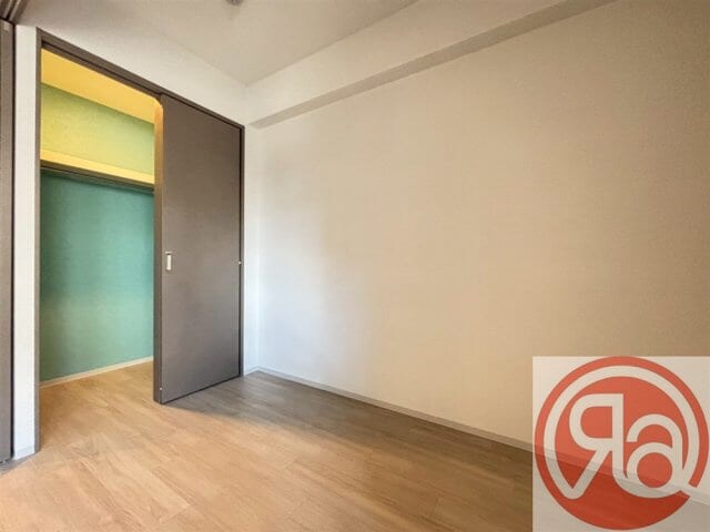 洋室は3.4帖の広さがあり、バルコニーに面した大きな窓から心地よい光が差し込む明るい空間です。明るい色調のフローリングが採用されているため、お部屋全体が実面積以上に広々と感じられる開放的な雰囲気となっています。壁面には、内部がアクセントカラーでおしゃれに彩られたクローゼットが設置されており、衣類や小物を機能的に収納することが可能です。また、エアコンが標準装備されているため、入居したその日から一年中快適な温度で過ごせるのも嬉しいポイントです。リビングとの仕切りには引き戸が採用されており、ライフスタイルに合わせて空間を柔軟に使い分けることができます。