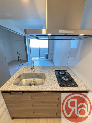 キッチンは、リビングを見渡しながら料理を楽しめる開放的なカウンターキッチンです。高級感のある石目調のワークトップには、2口のガスコンロとスタイリッシュなシングルレバー混合水栓のシンクがスマートに配置されています。上部にはフラットなデザインのレンジフードが設置されており、キッチン全体の洗練された雰囲気を引き立てています。また、キッチンの背面側には十分なスペースが確保されているため、冷蔵庫やカップボードも無理なく配置することが可能です。リビングとの一体感があるため、家族やゲストとの会話を楽しみながら、効率よく家事をこなせる機能的な空間となっています。