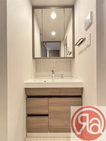 脱衣所は、木目調の扉とヘリンボーン柄のバックパネルを組み合わせた、意匠性の高い独立洗面台が印象的な空間です。三面鏡の裏側はすべて収納棚になっており、洗面小物を隠してすっきりと整理できるほか、足元にも引き出し式の収納が備わっています。スクエア型の洗面ボウルは広々としており、毎日の身支度も快適に行えます。また、室内洗濯機置き場も同じ空間に配置されており、脱衣から洗濯までの動線がスムーズに確保されています。モダンな内装デザインと機能的な設備が融合した、使い勝手の良いレイアウトです。