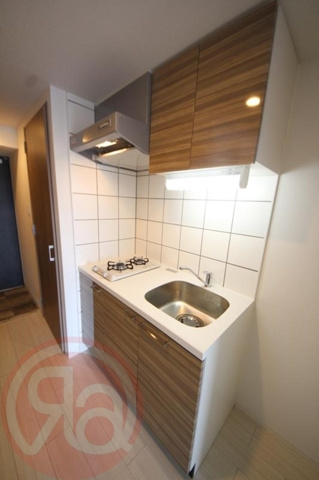 キッチンは、木目調のデザインが空間に温かみを添える、機能的なシステムキッチンが採用されています。自炊派に嬉しい2口のガスコンロが備わっており、メイン料理と汁物を同時に作るなど、効率よくお料理を楽しめるのが大きなメリットです。シンク下だけでなく上部にも吊り戸棚が設置されているため、食器や調理器具、ストック品などを分類して機能的に整理整頓できます。廊下部分を活用したコンパクトな設計ながら、お掃除がしやすいタイル貼りの壁面や明るい照明など、毎日の家事を心地よくサポートする工夫が詰まった空間です。