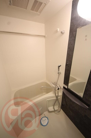 バスルームは、清潔感のあるホワイトの壁面に落ち着いたダークブラウンのアクセントパネルを組み合わせた、モダンで洗練された空間となっています。天候を気にせず洗濯物を乾かせる浴室乾燥機が完備されているため、湿気によるカビの発生を抑え、バスルームを常に衛生的に保てるのが大きなメリットです。ゆったりとした浴槽の側には縦型の大きな鏡と、シャンプーなどを置ける機能的な棚が設置されており、日々のバスタイムを快適にサポートしてくれます。洗い場も十分なスペースが確保されており、一日の疲れをゆっくりと癒やしてリフレッシュするのに最適な、心地よい住環境が整っています。