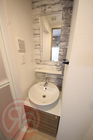 脱衣所は、毎日の身支度をスムーズに行えるよう、独立洗面台と洗濯機置き場が効率よく配置されています。洗面台はベッセル式の洗面ボウルを採用したおしゃれなデザインで、鏡の背景にあしらわれたウッド調のアクセント壁が洗練された空間を演出しています。壁面には浴室乾燥機や照明のスイッチ類がまとめられており、お風呂上がりの動線までしっかりと考慮された実用的な設計が魅力です。洗面台の下部には収納スペースも確保されているため、洗剤や掃除用具などの日用品をすっきりと整理して、清潔感のある状態を保つことができます。