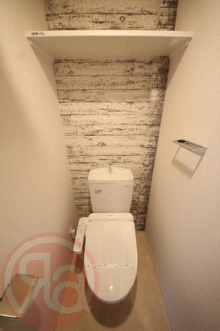 トイレは、温水洗浄便座が完備された、清潔感あふれる快適な個室空間となっています。背面にはヴィンテージウッド調のアクセントクロスが採用されており、スタイリッシュで落ち着いた雰囲気を演出しているのが印象的です。上部には予備のトイレットペーパーや掃除用品などを置くのに便利な棚が設置されており、空間を機能的に活用できます。手洗い付きのタンクやタオルハンガーも備わっており、限られたスペースながらも日々の使い勝手がしっかりと考えられた、心地よい空間に仕上げられています。